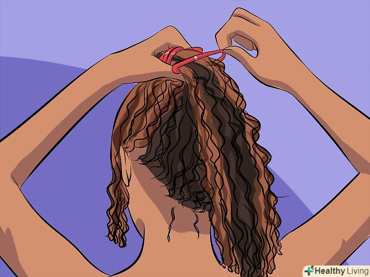 Під час миття вільно зв'яжіть локони ззаду. Моя локони перші кілька разів, вільно заплетене і зв'яжіть їх ззаду за допомогою спеціальних маленьких гумок для волосся. [1]- Якщо ви вільно сплетете локони, то уникнете їх витончення під час миття. Сплетіть локони вільно, тому що якщо ви заплетете їх туго, то через миття волосся можуть стати ламкими.