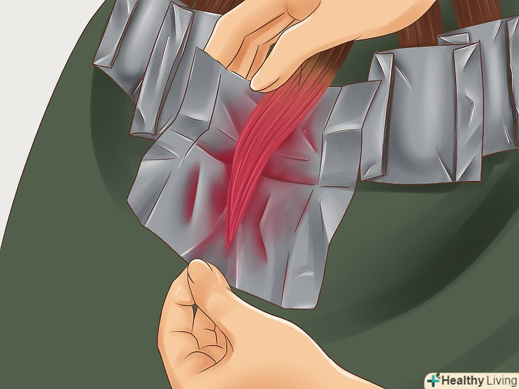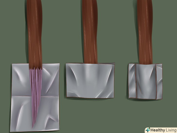 Прикрийте кінчики кожної секції волосся алюмінієвою фольгою. рівномірно розподіліть кінчики волосся по квадратику фольги, а потім загорніть його.- Ви також можете прикрити кінчики волосся поліетиленовими пакетами. Зафіксуйте їх на волоссі гумками для волосся.