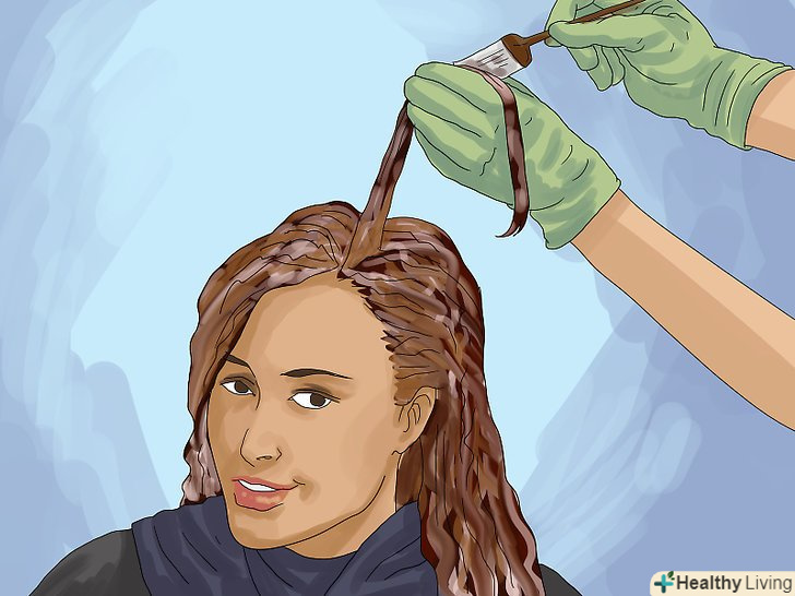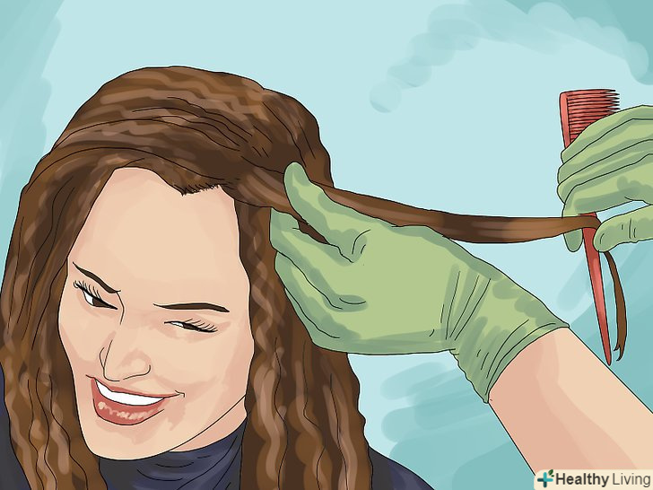 Нанесіть распрямитель на пасма по 3 мм.- Використовуйте для нанесення розпрямителя на пасма щіточку або 2,5 см кисть. Добре просочіть волосся распрямителем. Нанесіть розпрямитель на всі 4-е секції, поки волосся не будуть повністю оброблені.