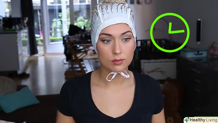Надіньте на голову прозору шапочку. у вашому наборі повинна бути прозора пластикова шапочка, така ж, як шапочка для купання, щоб захищати ваше волосся, поки йде мелірування. Одягніть її і чекайте, поки подіє розчин, близько 20 хвилин, або як зазначено в інструкції.- Чим довше ви будете тримати розчин, тим світліше будуть меліровані пасма.