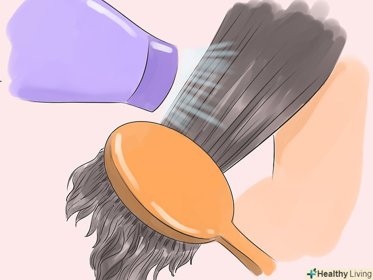 Висушіть кожне пасмо рухом вниз, використовуючи круглу щітку для волосся з комбінованим ворсом (натуральним і синтетичним). використовуйте комбіновану щітку, а не пластикову, оскільки пластикові травмують волосся. Щітки з комбінованим ворсом також називають щітками для витягування волосся. Покладіть на щітку невелике пасмо волосся і проведіть її вниз, одночасно просушуючи кожну ділянку пасма зверху вниз. [5]- Підносячи фен до коріння, розгортайте його від голови. Не сушіть пасмо рухом вгору, оскільки через це волосся можуть почати витися і пушіться.