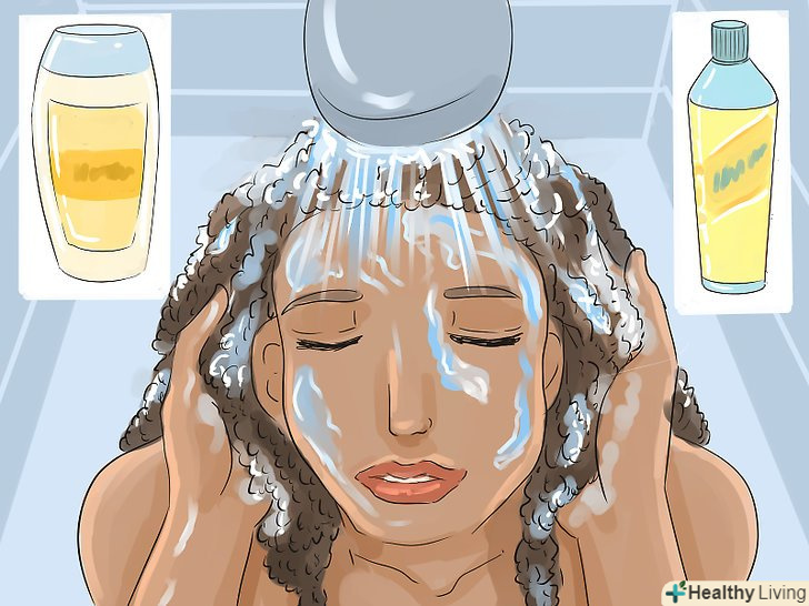 Розплутайте волосся за допомогою гребеня з широкими зубами. після душу нанесіть на волосся зволожуючий крем або незмивний кондиціонер в спреї. Пам'ятайте-яке б засіб ви не використовували, воно не повинно містити сульфатів. Акуратно розподіліть засіб по всьому волоссю від коренів до кінчиків. Потім легкими рухами розчешіть волосся гребенем з широкими зубами щоб позбутися від поплутаних ділянок. [3]- Якщо в міру розчісування вам будуть потрапляти нові сплутані ділянки, заново нанесіть трохи незмивного кондиціонера на ці пасма, щоб не розірвати волосся, які збилися в вузли.