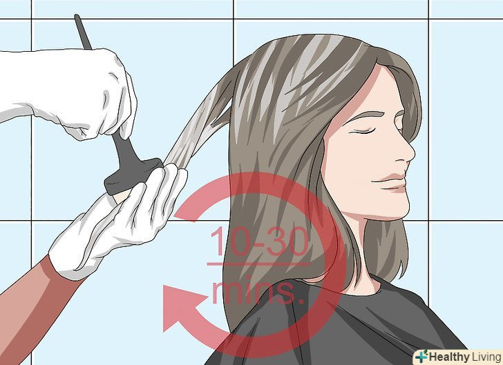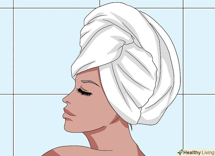Після нанесення маски накрийте голову шапочкою для душу і оберніть зверху гарячим рушником . покривши волосся маскою, надіньте шапочку для душу. Потім оберніть голову гарячим рушником поверх неї. Залиште на 10 хвилин. Це забезпечить масці більш прямий контакт зі шкірою голови, що підвищить ефективність її дії. [7]