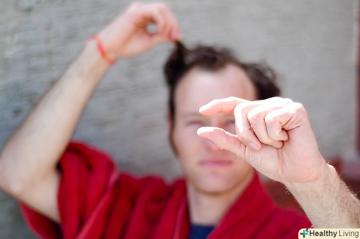 Підніміть волосся пальцями вгору, там, де ваш уявний проділ, і відріжте до бажаної довжини (зазвичай настільки, наскільки ваш палець у висоту від його голови).