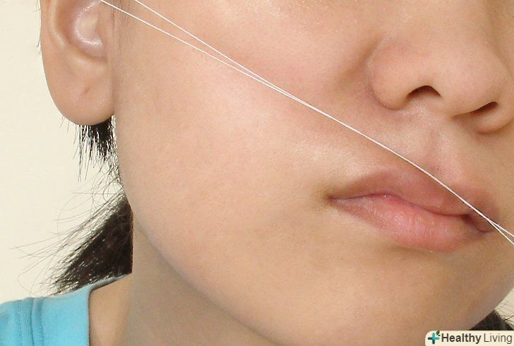 Помістіть нитку на цю ділянку. обмотана частина повинна знаходитися на одній стороні з ділянкою волосся, а нитка з іншого боку повинна бути по обидві сторони волосся, які ви хочете видалити.