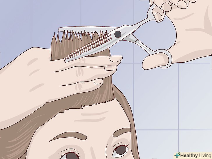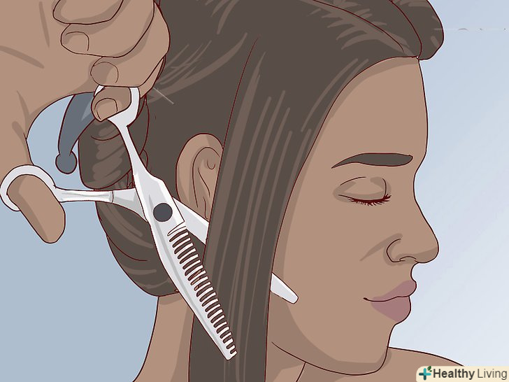 Іншою рукою візьміть філірувальні ножиці, щоб зрізати кінчик пасма. Прикладіть філіровочние ножиці до кінця пасма і зріжте її вглиб по діагоналі, відступивши від кінчиків приблизно на 2,5 см. При бажанні можна розгорнути ножиці і зрізати волосся в тому ж місці, але вже з ножицями, повернутими зубцями в протилежному напрямку. [3] [4]