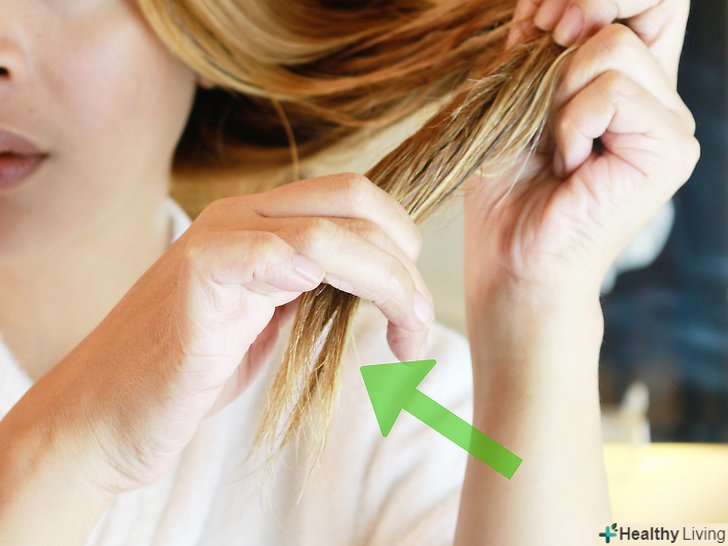 Обробіть посічені кінчики рідким вітаміном Е. Вітамін Е також можна використовувати для часткової обробки посічених кінчиків. Для цього вилийте собі на долоню трохи рідкого вітаміну Е.розітріть долоні, а потім стисніть в них кінчики волосся. Втирайте Вітамін Е в кінчики. Залиште масло на волоссі і покладіть їх.- Цю процедуру можна виконувати як на сухих, так і на мокрих волоссі.