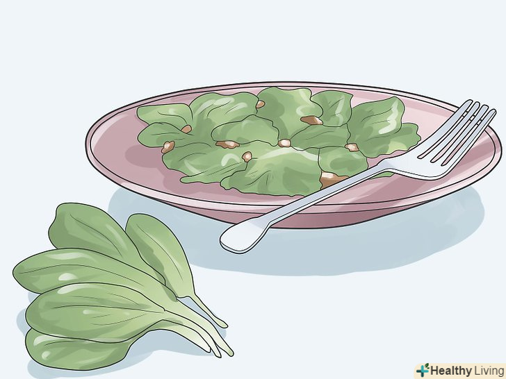 Їжте шпинат. Шпинат – супер-їжа, в якій міститься залізо, бетакаротин, фолат і вітамін C. все це важливо для краси і блиску волосся, так як завдяки цим речовинам стимулюється виробництво масел в шкірі голови, що сприяє оздоровленню волосяних фолікулів.- Якщо ви не фанат шпинату, спробуйте їсти інші листові овочі, багаті поживними речовинами: брокколі, листову капусту, мангольд.