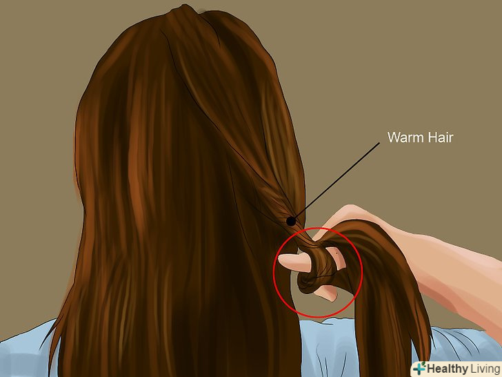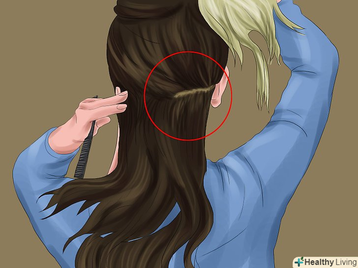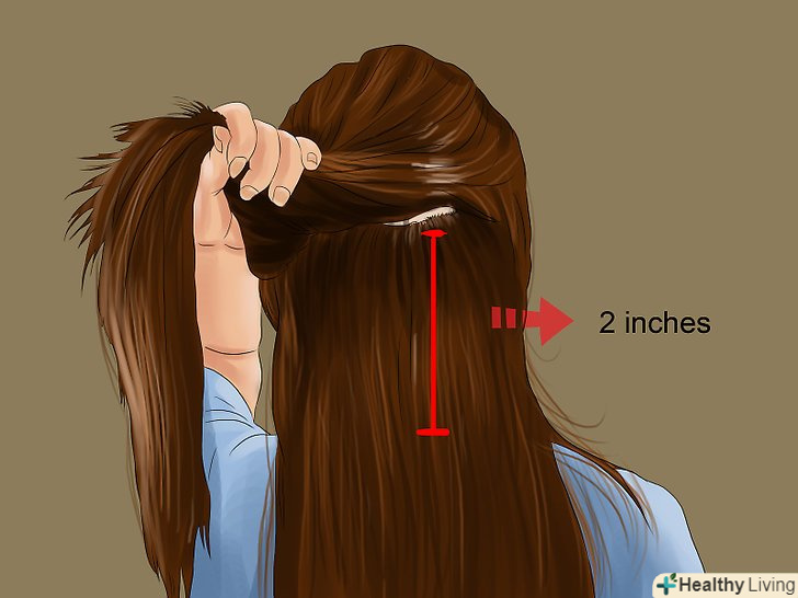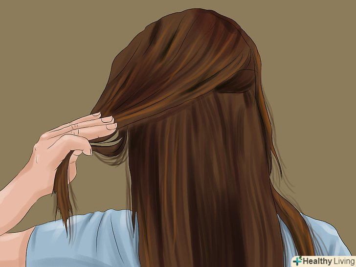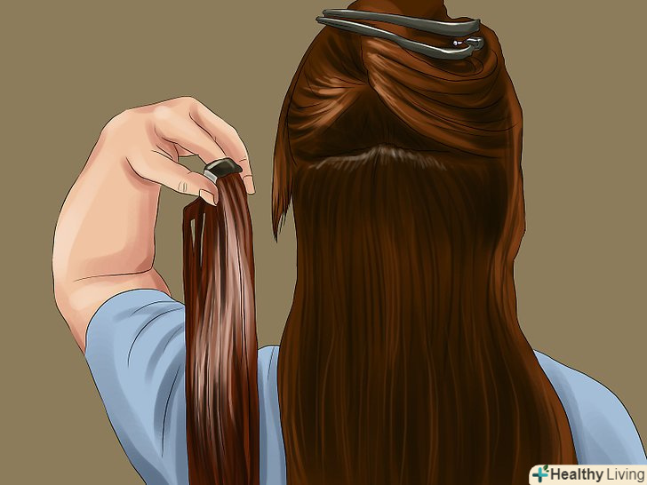 Проведіть пасмо волосся в роздільник. це буде перша пасмо, яку ви обробите, накладна пасмо повинна бути з нею приблизно одного розміру. Якщо вам необхідно, прикріпіть роздільник до волосся невидимкою або шпилькою для волосся.