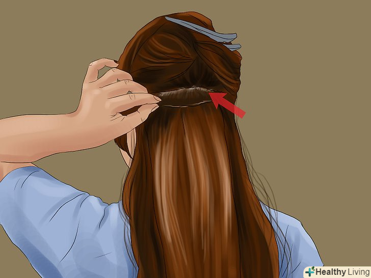 Візьміть одну пасмо і приколіть до коріння свого волосся. Ви повинні докопатися до самої середини начісування, щоб пасмо краще зафіксувалася.- Рівномірно розташовуйте накладні пасма, щоб волосся по всій голові були також рівномірно розподілені.