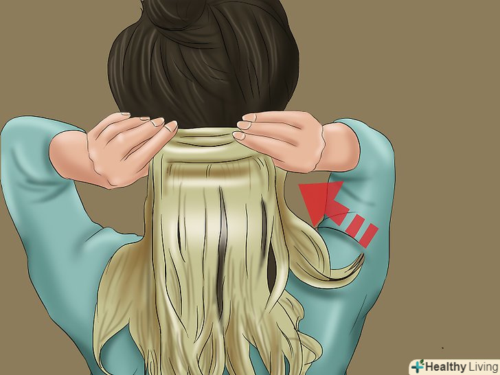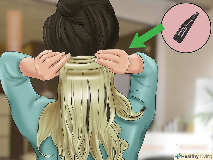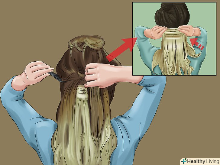 - Переконайтеся, що шпильки від накладних пасом не видно, навіть якщо ви зав'яжете волосся в кінський хвіст. Вони повинні розташовуватися дуже близько до коріння волосся і ховатися під їх шарами так, щоб їх не можна було побачити неозброєним оком. [2]