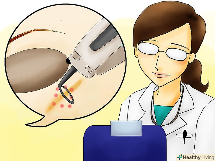 Дізнайтеся у дерматолога про лазерне шліфування шкіри та пункційну ексцизію з подальшою трансплантацією. ці процедури ефективні в разі глибоких шрамів, що виникли в результаті акне або хірургічного втручання. Зверніть увагу, що дані процедури повинні проводитися тільки кваліфікованим дерматологом. [6]- Суть процедури лазерної шліфовки полягає у видаленні епідермісу за допомогою високоенергетичного лазерного променя.