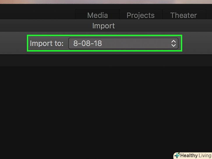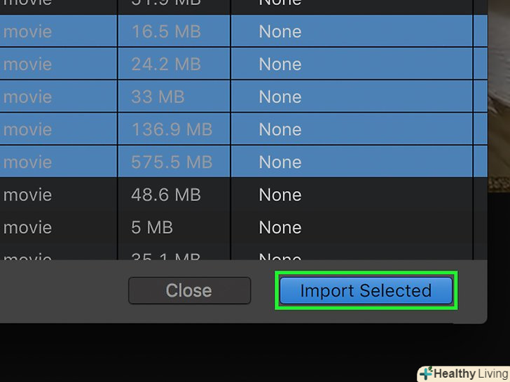 Натисніть наІмпортувати вибрані в правому нижньому кутку.вибрані відео будуть імпортовані в те місце, яке ви вказали для iMovie.- Щоб додати відео до іншого проекту, двічі клацніть на вкладці "проекти", потім" мої медіа " у верхньому лівому куті та перетягніть нове відео на часову шкалу проекту.