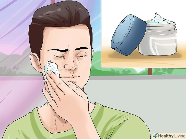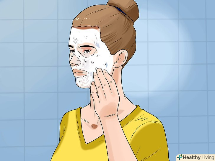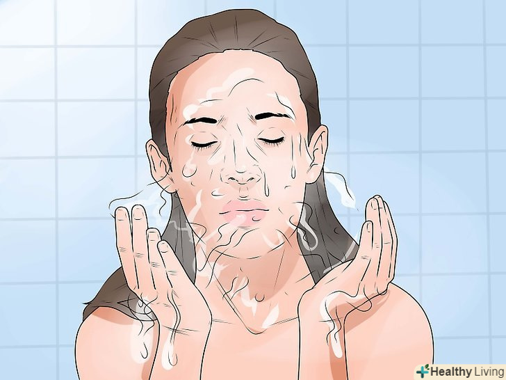 - Вмийтеся теплою водою і пальцями ніжно нанесіть засіб для вмивання на шкіру. Не використовуйте мочалку або щітку для цієї мети. Не тріть шкіру обличчя, промокніть її насухо м'яким рушником і нанесіть зволожуючий крем. Вмивайтеся не частіше двох разів на день або після сильного потовиділення. [15]