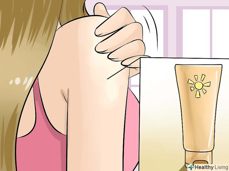 Нанесіть сонцезахисний засіб на всю шкіру. не забудьте про таких областях, як вуха, шия, верхня часто ніг і рук, і навіть частково волосисті частини голови. Будь-які ділянки шкіри, що піддаються сонячному випромінюванню, повинні бути захищені сонцезахисним засобом. [23]- Зазвичай вам складно намазати засобом важкодоступні місця, наприклад, спину. Попросіть когось нанести сонцезахисний засіб на це місце. [24]