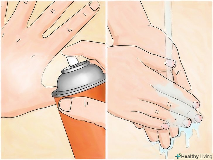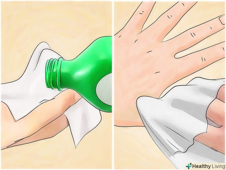 Використовуйте спирт або засіб для зняття лаку, щоб видалити великі плями. ці речовини сушать шкіру, проте вони досить ефективні. Налийте невелику кількість обраного речовини на тканинну серветку або губку і потріть руки. Зачекайте трохи, перш ніж змивати обраний засіб з шкіри рук. Вимийте руки водою з милом.- Спиртові серветки, використовувані для дезінфекції, які зазвичай можна знайти в аптечці, є відмінним засобом для видалення деревного соку з рук.