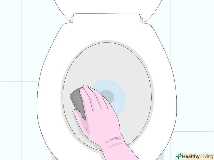 Видаляйте плями на унітазі. Пемза дозволяє видаляти забруднення всередині унітазу. Перш за все надіньте щільні рукавички для прибирання. Потім просто обробіть пемзою плями. Відтирайте пляма до тих пір, поки воно не зникне. [8]- Для неподдающихся плям можна використовувати пемзу в поєднанні із засобами для очищення унітазу.