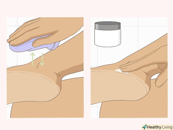 Висушіть і зволожите шкіру. коли закінчите, просушіть шкіру рушником. Обробіть ділянки лосьйоном або кремом, щоб шкіра не пересихала занадто швидко. Ділянки з раніше омертвілої шкірою повинні стати м'якими і блискучими.- Обробіть шкіру кокосовим маслом, мигдальним маслом або лосьйоном для тіла.