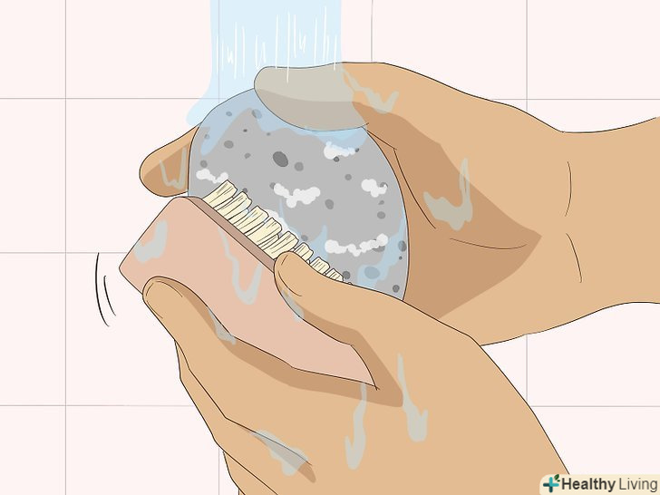 Очистіть пемзу після використання. омертвіла шкіра накопичується в порах каменю, тому пемзу потрібно очистити після використання. Використовуйте жорстку щітку, щоб очистити камінь під проточною водою. Додайте невелику кількість мила. Так пемза буде чистою і готовою до використання.