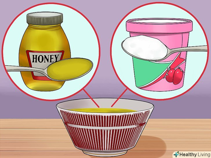 Змішайте мед з йогуртом. можна приготувати Очищуючий засіб з меду і йогурту. Налийте в миску або тарілку 1 столову ложку (15 мілілітрів) меду. Додайте 1 чайну ложку (5 мілілітрів) йогурту. Як слід перемішайте інгредієнти. Вимийте обличчя і руки і розітріть приготовлену суміш по шкірі обличчя. [10]- Залиште суміш на 10-15 хвилин, потім змийте її теплою водою.