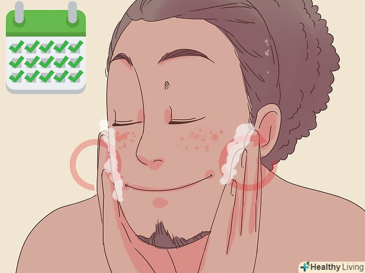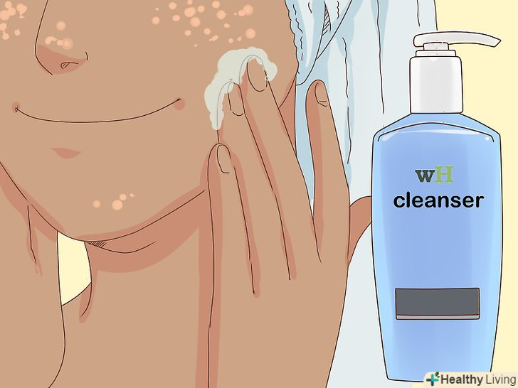 Нанесіть миючий засіб. [1] хороший миючий засіб ефективно видаляє бруд і бактерії з вашої шкіри. Можливо, ви захочете відправитися до дерматолога на чистку обличчя, проте миючий засіб з супермаркету теж може відмінно впоратися з цим завданням. Видавіть трохи миючого засобу на руки втирайте на обличчя протягом однієї хвилини. Для рівномірного розподілу засобу, що очищає наносите його невеликими круговими рухами. Обполосніть обличчя гарячою водою, після того як рівномірно розподілили Очищуючий засіб.- Якщо у вас немає засобу для чищення під рукою, використовуйте антибактеріальне мило як альтернативу.