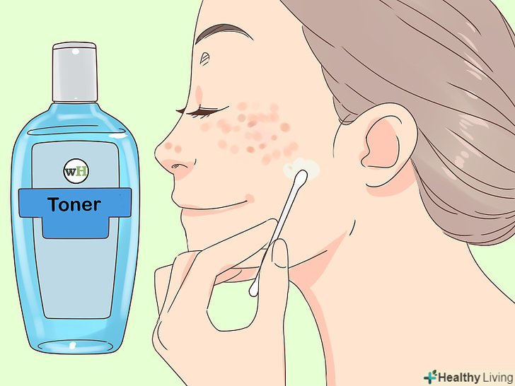 Використовуйте тонік для обличчя. [3] Тонік використовується для подальшого очищення шкіри і звуження пор. Хороший тонік допоможе відновити природний рН баланс вашої шкіри і використовується після вмивання і відлущування. Тонік можна наносити ватним тампоном. Як і попередні засоби, тонік можна використовувати:- Якщо у вас жирна шкіра, в'яжучий тонік допоможе видалити надлишки масла, зберігаючи вашу шкіру чистою. В'яжучі тоніки часто містять спирт і саліцилову кислоту і їх можна купити в аптеці або магазині.