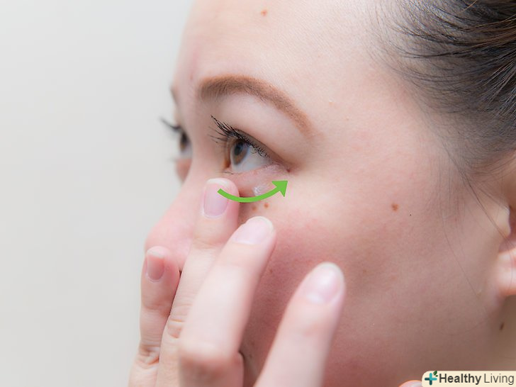 Спочатку нанесіть крем для очей, якщо ви ним користуєтеся. візьміть невелику кількість засобу безіменним пальцем і акуратними поплескування нанесіть крем на область нижніх повік. Не натягуйте шкіру під очима.- Безіменний палець є найслабшим пальцем, що робить його ідеальним для ніжної шкіри під очима.