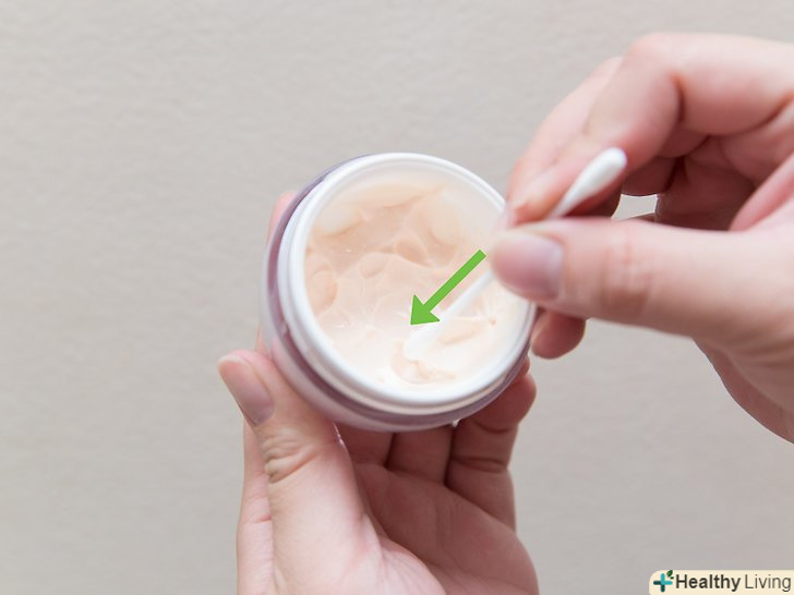 Видавіть невелику кількість (розміром з горошину) крему для обличчя на тильну сторону руки. не хвилюйтеся, якщо видавили занадто мало. Часом навіть крапелька творить чудеса. І потім, ви завжди можете нанести ще, якщо буде потрібно.- Якщо крем знаходиться в баночці, зачерпніть невелику кількість за допомогою маленької ложки, лопатки або ватної палички. Так ви не занесете бактерії з пальців в вміст баночки. Спеціальну лопатку можна знайти в більшості магазинів косметики.