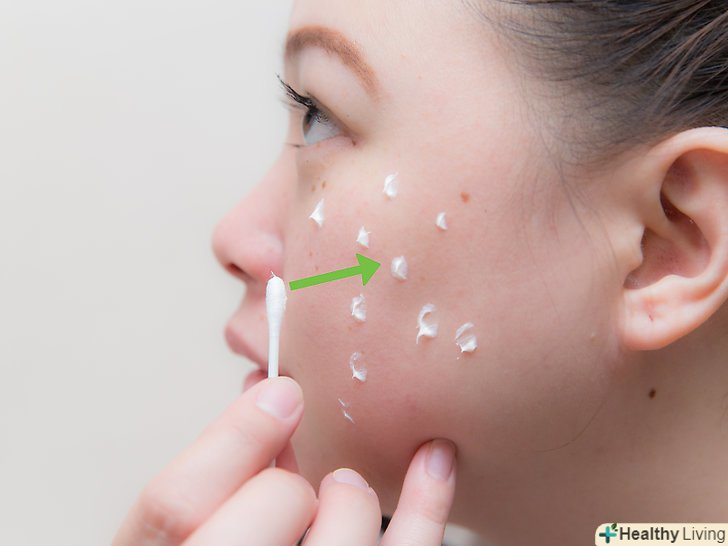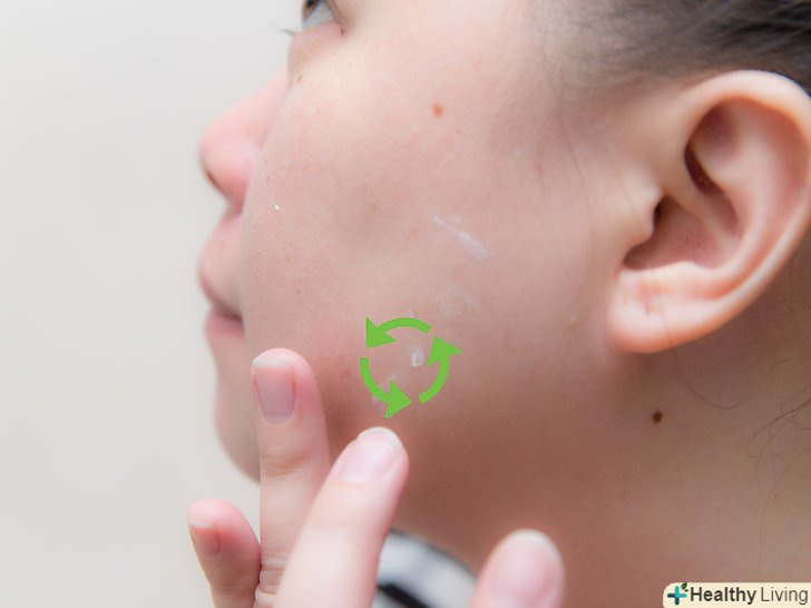Почніть наносити крем на обличчя. Наносите крем маленькими точками. Зосередьтеся на проблемних зонах, таких як щоки і лоб. Уникайте областей, які схильні до рясного скупчення шкірного сала, а саме складок по обидва боки від ніздрів.- Якщо у вас комбінована шкіра, більшу увагу приділяйте сухим областям, а менше — жирним.