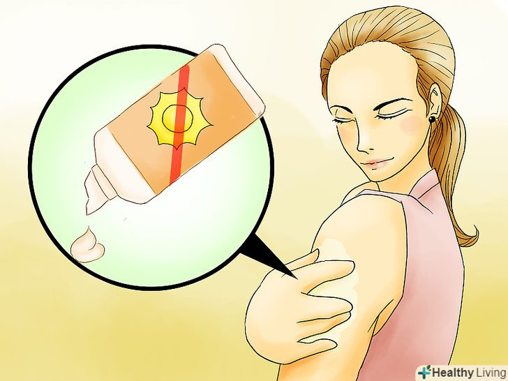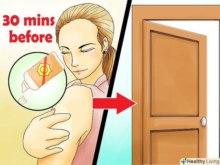 Наносите сонцезахисний засіб за 30 хвилин до виходу на вулицю і оновлюйте кожні 2 години. [9] 30 мл сонцезахисного засобу (грубо кажучи, кількість, яка наповнить чарку-шот) має бути достатньо. Існує безліч різних варіантів, так що використовуйте найвищу ступінь захисту, якщо плануєте інтенсивну фізичну активність на сонці.- Якщо ви витираєтеся рушником після купання, ви перете захист, яку нанесли, так що вам необхідно використовувати її заново.