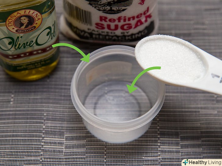 Відлущуйте шкіру. додайте сіль до оливкової олії, щоб приготувати натуральний скраб для обличчя. [15] змішайте приблизно столову ложку (15 мл) масла і пів чайної ложки (3,5 г) солі або цукру (2,5 г), нанесіть на обличчя, а потім змийте теплою водою. [16]- Цукор є менш абразивним, ніж сіль, так що використовуйте його, якщо у вас чутлива шкіра. Коричневий цукор ще м'якше, ніж цукровий пісок, тому ідеально підходить для дуже чутливої шкіри. [17]