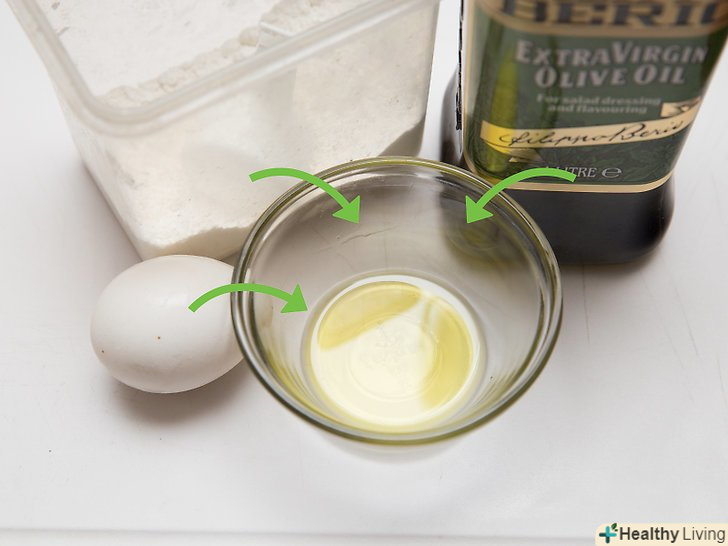 Приготуйте маску. оливкова олія можна змішати з низкою інших натуральних засобів, щоб приготувати маску для обличчя. Ефект маски буде залежати від доданих компонентів.- Для сухої шкіри змішайте пів столової ложки (7,5 мл) оливкової олії з яєчним жовтком і столовою ложкою (8,5 г) борошна. Якщо паста вийшла занадто густий і її не можна розмазати, додайте більше масла. Нанесіть маску на обличчя і залиште на 20 хвилин, щоб вона зволожила шкіру. [23]
