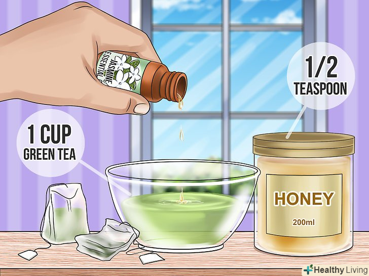 Приготуйте тонік з зеленого чаю, який підходить для всіх типів шкіри. просто змішайте разом чашку (240 мл) зеленого чаю і пів чайної ложки (2,5 мл) меду. Коли суміш охолоне, додайте 3 краплі ефірного масла жасмину і розмішайте. Зберігайте тонік в герметичній пляшечці в прохолодному місці. [16]- Вважається, що зелений чай стимулює омолодження клітин шкіри. [17]