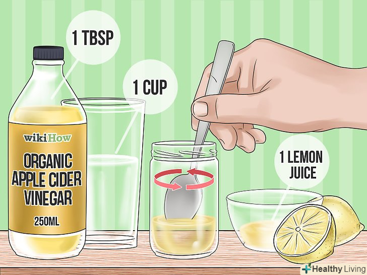 Використовуйте суміш з яблучним оцтом для жирного типу шкіри. приготуйте тонік для жирної шкіри, змішавши сік одного лимона зі столовою ложкою (15 мл) яблучного оцту. Додайте 200 мл мінеральної води і гарненько все розмішайте. Вилийте суміш в герметичну ємність і зберігайте в прохолодному місці. [18]