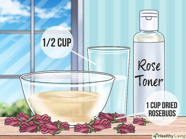 Приготуйте тонік з рожевою водою для чутливої шкіри. візьміть склянку сушених бутонів троянд і висипте в каструлю або миску. Залийте бутони половиною склянки (120 мл) киплячої води (вода повинна бути фільтрованої або бутильованої) і залиште настоюватися протягом одного-двох годин. Процідіть рідину через друшляк, щоб прибрати бутони, а потім вилийте рожеву воду в герметичну ємність і приберіть в холодильник. [21]- Домашню рожеву воду слід використовувати протягом тижня, так що приготуйте її стільки, щоб вистачило на тиждень (1 склянки або 240 мл повинно вистачити).
