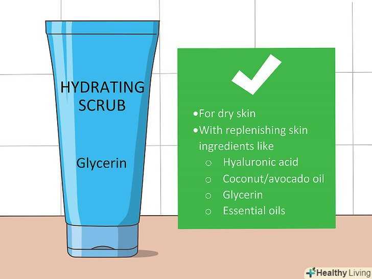 Виберіть зволожуючий скраб, якщо у вас суха шкіра. незважаючи на те, що цукор сам по собі є природним зволожувачем (він добре утримує вологу), деякі скраби зволожують краще, ніж інші. [3] Якщо ваша шкіра схильна до зневоднення, то виберіть скраб з інгредієнтами, що відновлюють шкіру, наприклад з гіалуроновою кислотою, маслом кокоса або авокадо, гліцерином, або ефірними маслами.