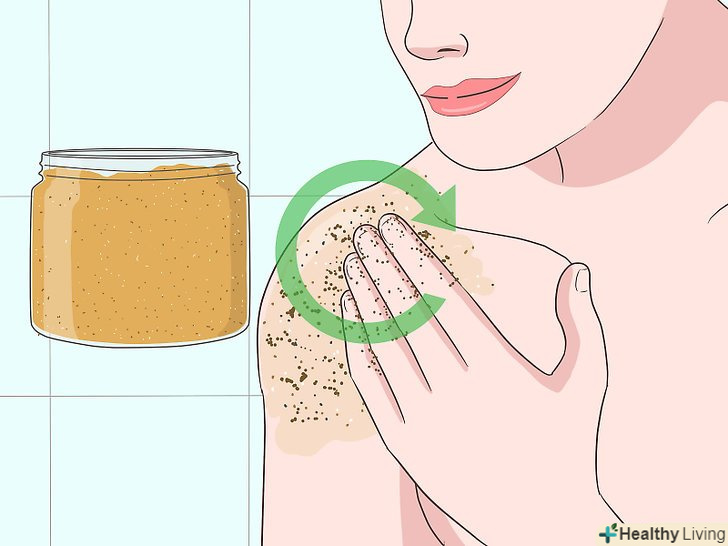 Масажними рухами втирайте скраб в шкіру. Втирайте цукровий скраб подушечками пальців м'якими круговими рухами. Так ви не тільки позбудетеся від омертвілої шкіри, але і також поліпшите кровообіг і простимулюєте вироблення колагену, білка, який допомагає боротися зі зморшками і зберігає молодість шкіри. [7]- Почніть з верхньої половини тіла і рухайтеся вниз.