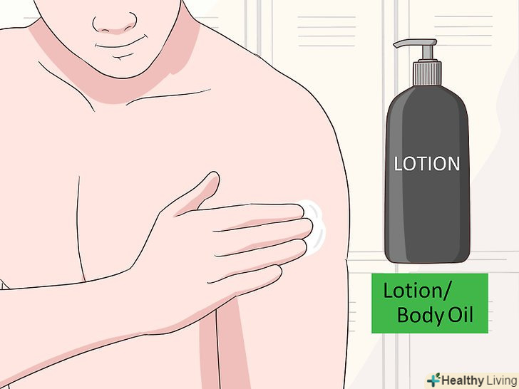 В кінці нанесіть лосьйон або масло для тіла. коли ви обсохнете, нанесіть лосьйон або Масло для тіла для зволоження шкіри, яку ви тільки що відлущували. Зробіть це відразу після висихання, поки пори ще відкриті і здатні легше і швидше увібрати зволожуючий засіб. [8]- Може, у вас є банку кокосового масла першого холодного віджиму (extra virgin), яке ви не використовуєте? Завдяки високому вмісту насичених жирів кокосове масло є одночасно дешевим і ефективним зволожуючим засобом. Не використовуйте кокосове масло, якщо ви схильні до висипань. [9]
