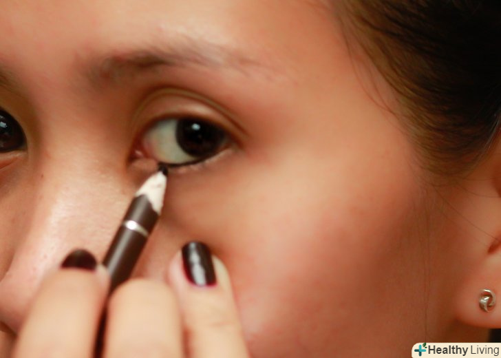 - Очі: накладіть невеликі цятки хайлайтера на частину століття над очним яблуком, погляд розкриється. Світло-рожевим або білим олівцем для очей підведіть нижню повіку уздовж росту вій.