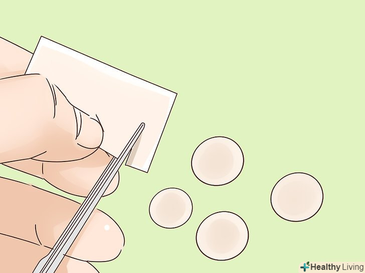 Відріжте гідроколлоїдну пов'язку, щоб накласти її на видавлений прищ. їх можна купити в більшості аптек або універмагах. Відріжте досить великий шматок гідроколоїдної пов'язки, щоб її можна було накласти поверх тієї ділянки шкіри, де розташований прищ. Після цього видаліть паперову підкладку, щоб оголити клей. [5]- Якщо пов'язка вже відповідає розміру прища, пропустіть цей крок.