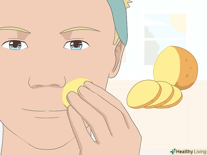 Потріть шкіру сирою картоплею, щоб освітлити вікові плями. наріжте картоплю скибочками і змочіть кожен з них невеликою кількістю води. Натріть картоплею шкіру або прикладіть скибочки до тієї ділянки, який ви хочете освітлити, наприклад до вікового плями. Який би спосіб ви не використовували, змийте картопляний сік теплою водою приблизно через 10 хвилин. [8]- Крохмаль і цукор, що містяться в картоплі, допомагають відлущувати шкіру, а вітамін C, калій, цинк та інші поживні речовини омолоджують і освітлюють її.