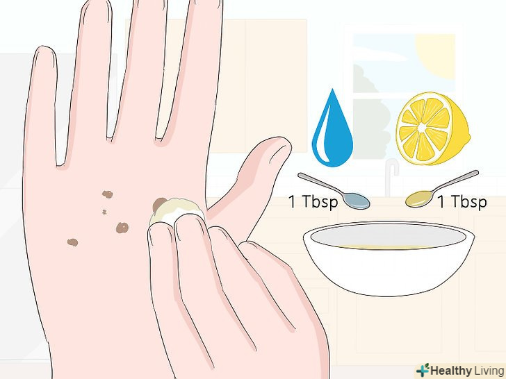 Обполіскуйте шкіру перед сном соком лимона, щоб очистити і освітлити її. видавіть в чашку приблизно 1 столову ложку (15 мілілітрів) лимонного соку, додайте 1 столову ложку (15 мілілітрів) води і перемішайте. Змочіть приготованим розчином ватяну кульку і протріть їм ту ділянку шкіри, який ви хочете освітлити. Приблизно через 20 хвилин акуратно змийте розчин теплою водою, промокніть шкіру м'яким рушником і нанесіть зволожувач для обличчя. [10]- Для кращих результатів повторюйте дану процедуру три рази в тиждень.