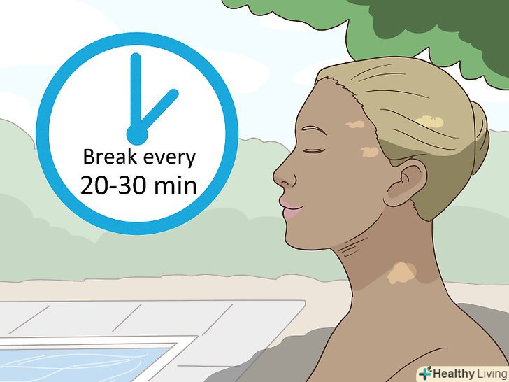 Робіть перерви кожні 20-30 хвилин. не залишайтеся на сонці протягом довгого часу. Пошкодження шкіри в результаті тривалого перебування на сонці підвищують ризик розвитку раку шкіри. Кожні 20-30 хвилин заходьте в приміщення або вставайте під тінь на кілька хвилин, щоб шкіра могла відпочити. [9]- Дотримуйтесь цього правила навіть у похмуру погоду. Сонячні промені досить сильні і з легкістю проходять через хмари.