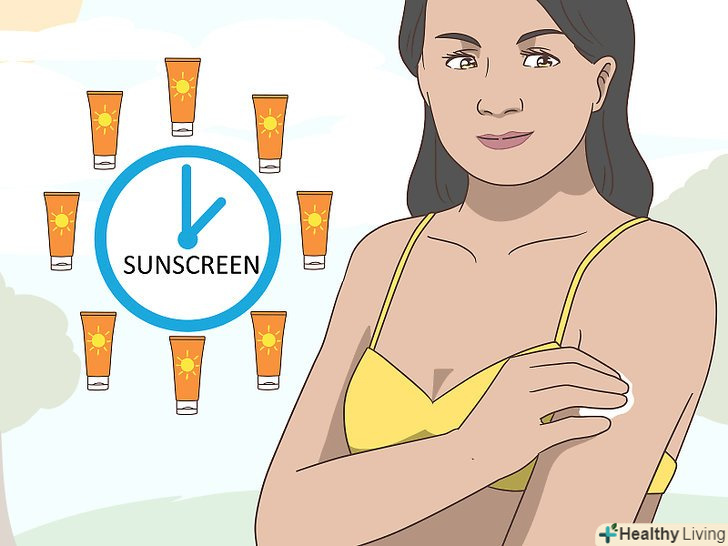 Нанесіть на шкіру сонцезахисний крем протягом усього дня. Прочитайте інструкцію на упаковці крему, щоб дізнатися, як часто його потрібно наносити. Сонцезахисний крем слід повторно наносити протягом усього дня, щоб захистити шкіру від сонця. [12]- Але якщо ви спітнієте або вирішите поплавати, то сонцезахисний крем змиється, і вам доведеться знову його нанести.