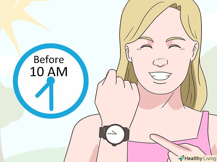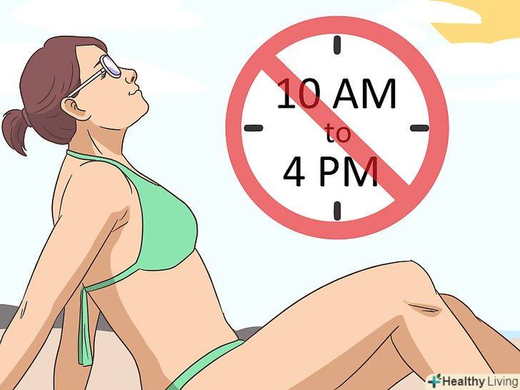 Не засмагайте з 10:00 до 16:00 години дня. Пікова активність Сонця припадають між 10 ранку і 4 вечора. У цей проміжок дня сонячні промені найбільш шкідливі для шкіри. Не засмагайте в цей час, щоб уникнути раку шкіри. Сонце дуже шкідливо в ці години, незважаючи на погоду. [13]