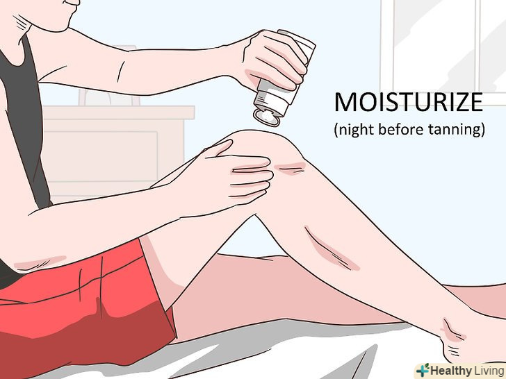 Зволожите шкіру в ніч перед засмагою. оскільки засмага по суті є пошкодженням шкіри, ваша шкіра повинна бути якомога здоровішою до засмаги. Напередодні засмаги нанесіть на все тіло свій звичайний зволожуючий крем. Особливу увагу приділіть таким проблемним ділянкам, як коліна і плечі. [2]- Для максимального ефекту купіть лосьйон для засмаги, спеціально призначений для зволоження шкіри на сонці. Якщо ви думаєте, що в похмуру погоду від нього немає ніякої користі, не забувайте, що сонячні промені проходять крізь хмари. Поки ви знаходитесь на вулиці, ви не захищені від сонця навіть у похмурі дні .