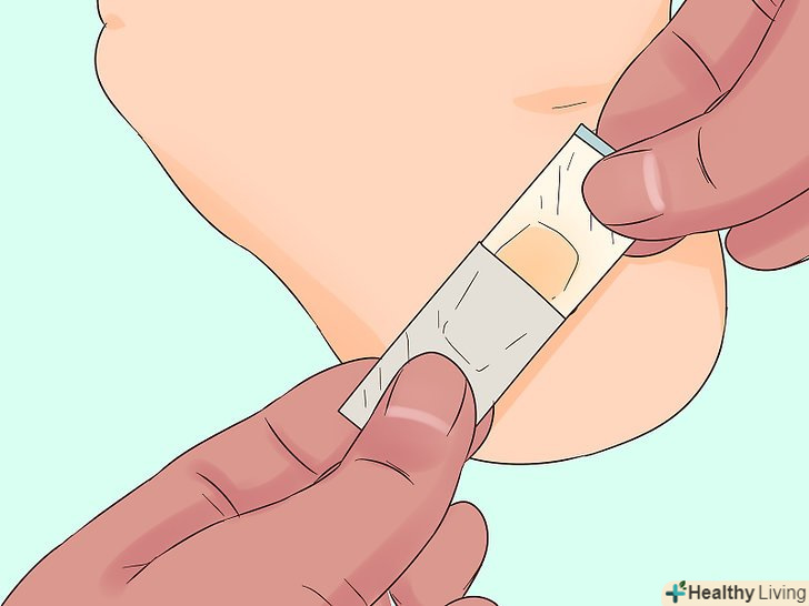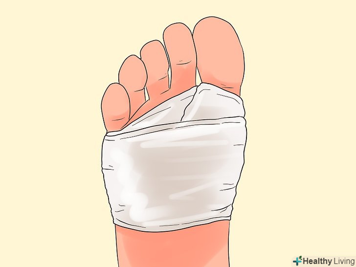 Наклейте пластир на лопнули мозолі. Захистіть лопнули мозолі, щоб в них не потрапила інфекція. Використовуйте пластир або нещільно обв'яжіть область бинтом. Слідкуйте, щоб клейка частина пластиру не торкалася мозолі. [7]- Міняйте пов'язку або пластир раз в день або кожен раз, коли вони намокнуть або забрудняться.