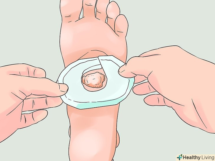Захищайте нелопнувшіе мозолі. йдучи з дому або приступаючи до будь-якої діяльності, захищайте неушкоджені мозолі, щоб вони випадково не лопнули. Нещільно перев'яжіть мозоль бинтом або прикрийте її мозольним пластиром з отвором. [2]- Пластирі з отвором можна придбати в більшості аптек. Такі пластирі створюють захисний бар'єр навколо мозолі, при це дозволяючи їй "дихати".