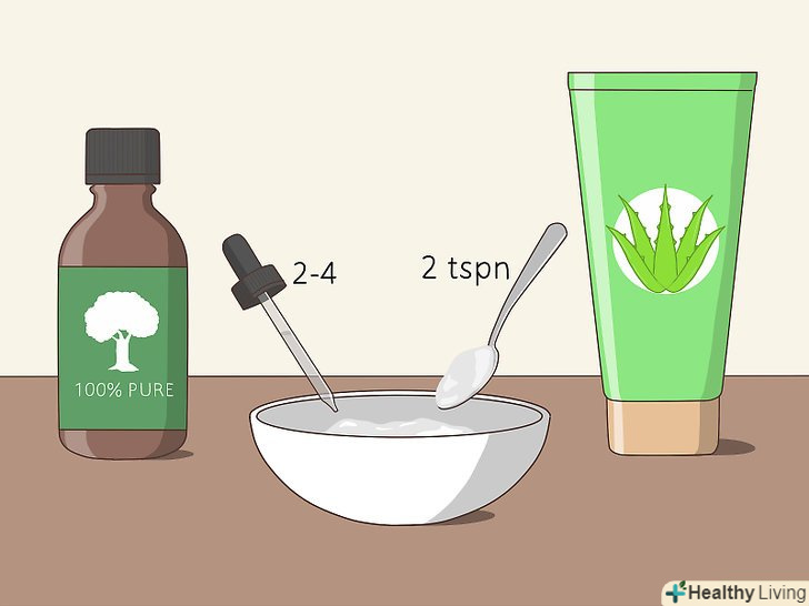 При необхідності проведіть точкове лікування в домашніх умовах. якщо ви виявили, що чисте, нерозбавлене масло чайного дерева трохи агресивно поводиться у вас на шкірі або сушить її, спробуйте Домашнє точкове лікування. Просто змішайте пару крапель засобу з 2 чайними ложками гелю алое вера, водою і базовим маслом середньої в'язкості, наприклад, кокосовим або оливковою.- Масло чайного дерева може бути дуже ефективним при лікуванні акне, навіть якщо його частка в розчині для точкового лікування становить всього 5%. [4]