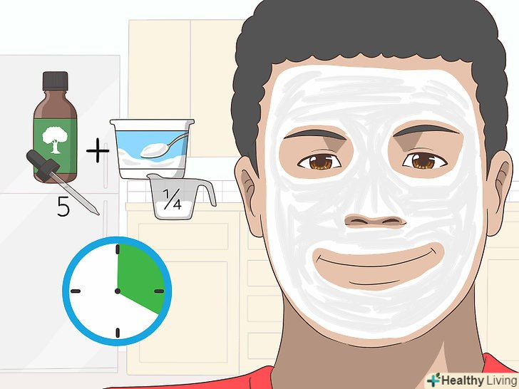 Використовуйте масло чайного дерева, щоб зробити домашню маску для обличчя. можна додати пару крапель засобу в домашні маски для обличчя, щоб убити бактерії і висушити прищі. Зробіть маску для обличчя з натуральних інгредієнтів.- Змішайте 3-4 краплі олії чайного дерева з 2 столовими ложками сухої зеленої глини, яку можна знайти в більшості магазинів здорового харчування. Вмішайте достатню кількість води, щоб глина перетворилася в пасту, яку можна розподілити по шкірі. Рівномірно нанесіть суміш, залиште приблизно на 20 хвилин, а потім змийте теплою водою і висушіть шкіру легкими рухами.